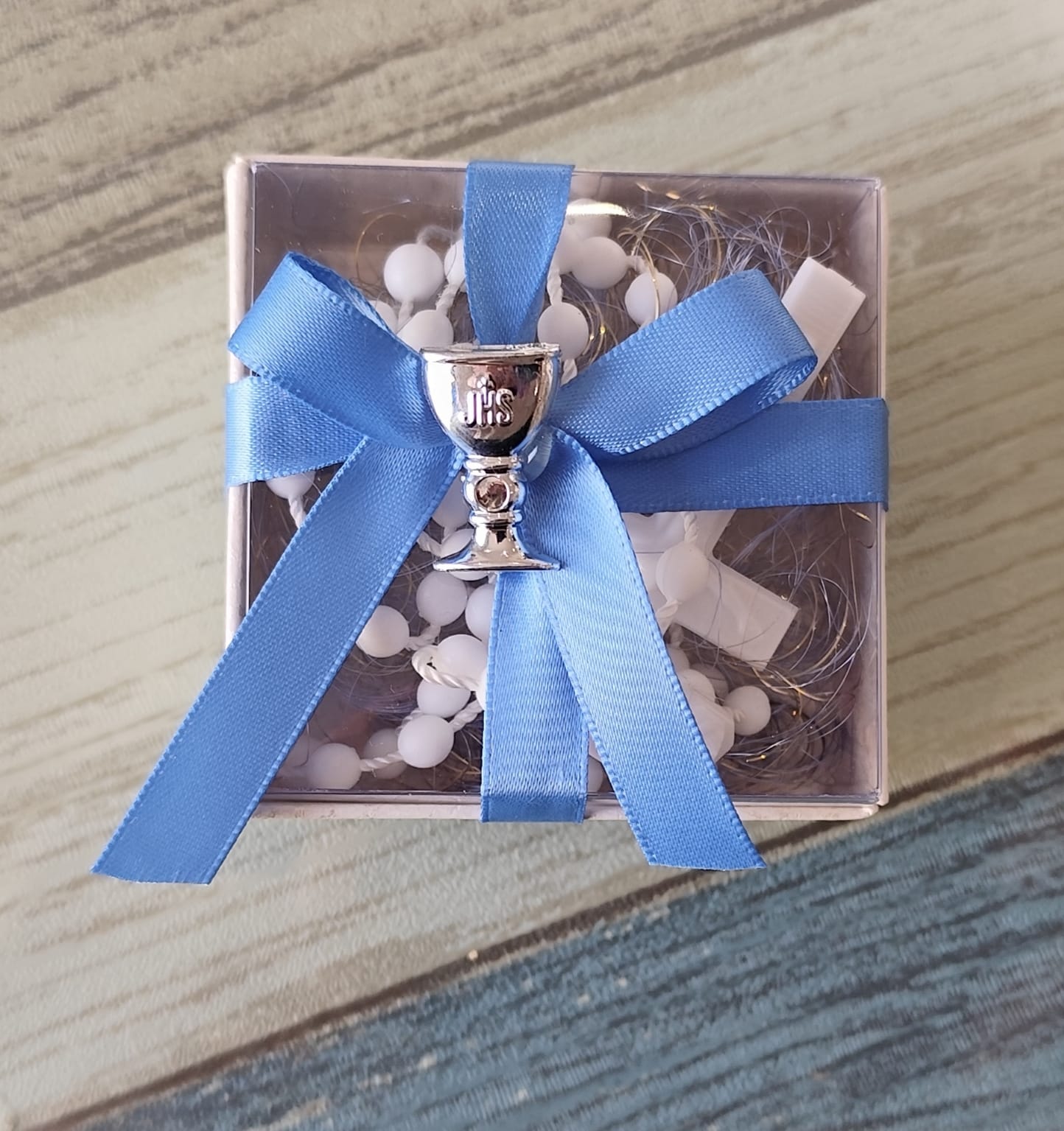 Caixa transparente com terço branco e laço azul