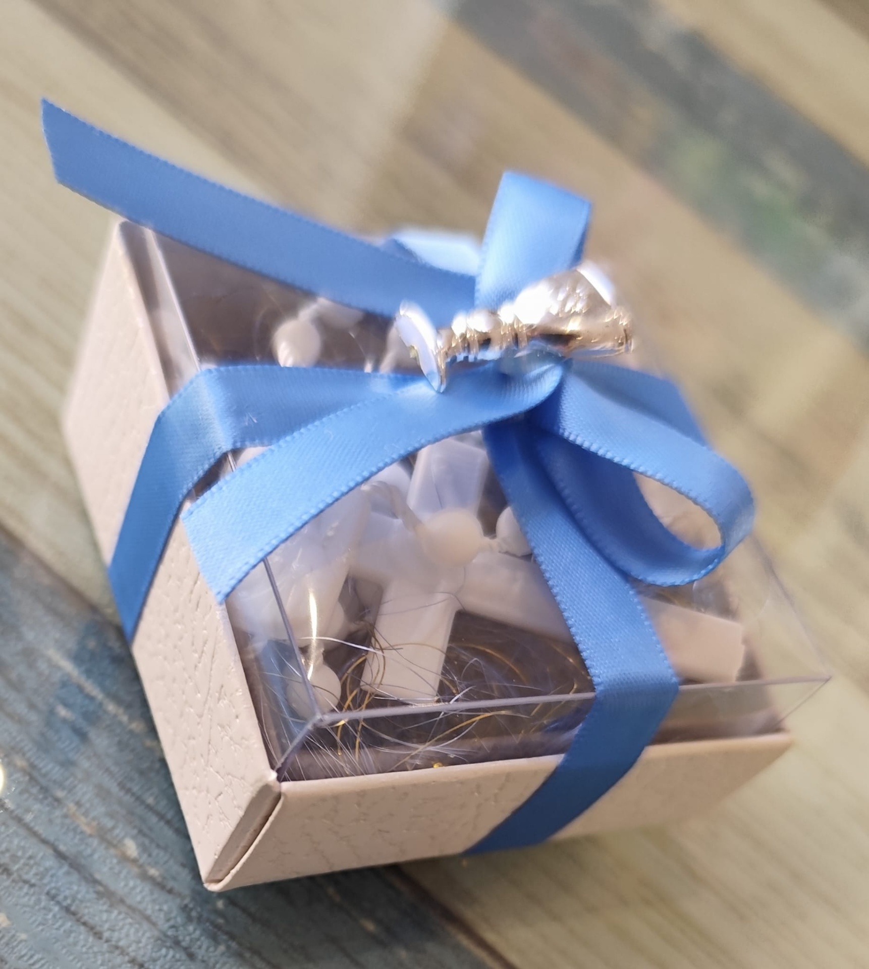 Caixa pequena com cruzes brancas e fita azul com sino prateado