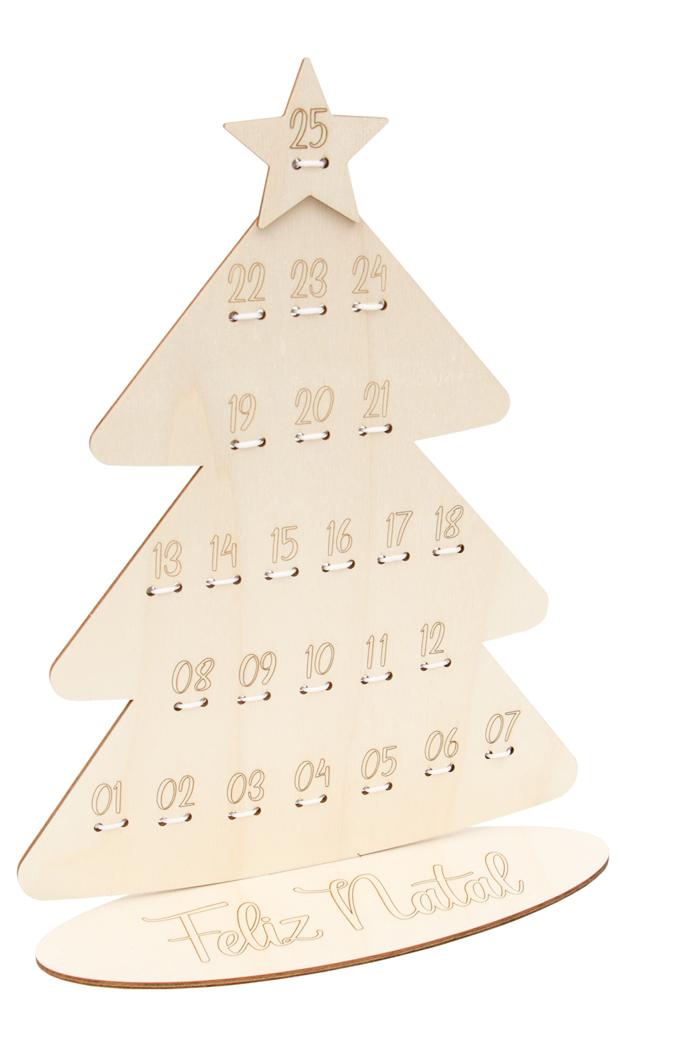 Árvore de Natal em madeira clara com números e gravação Feliz Natal