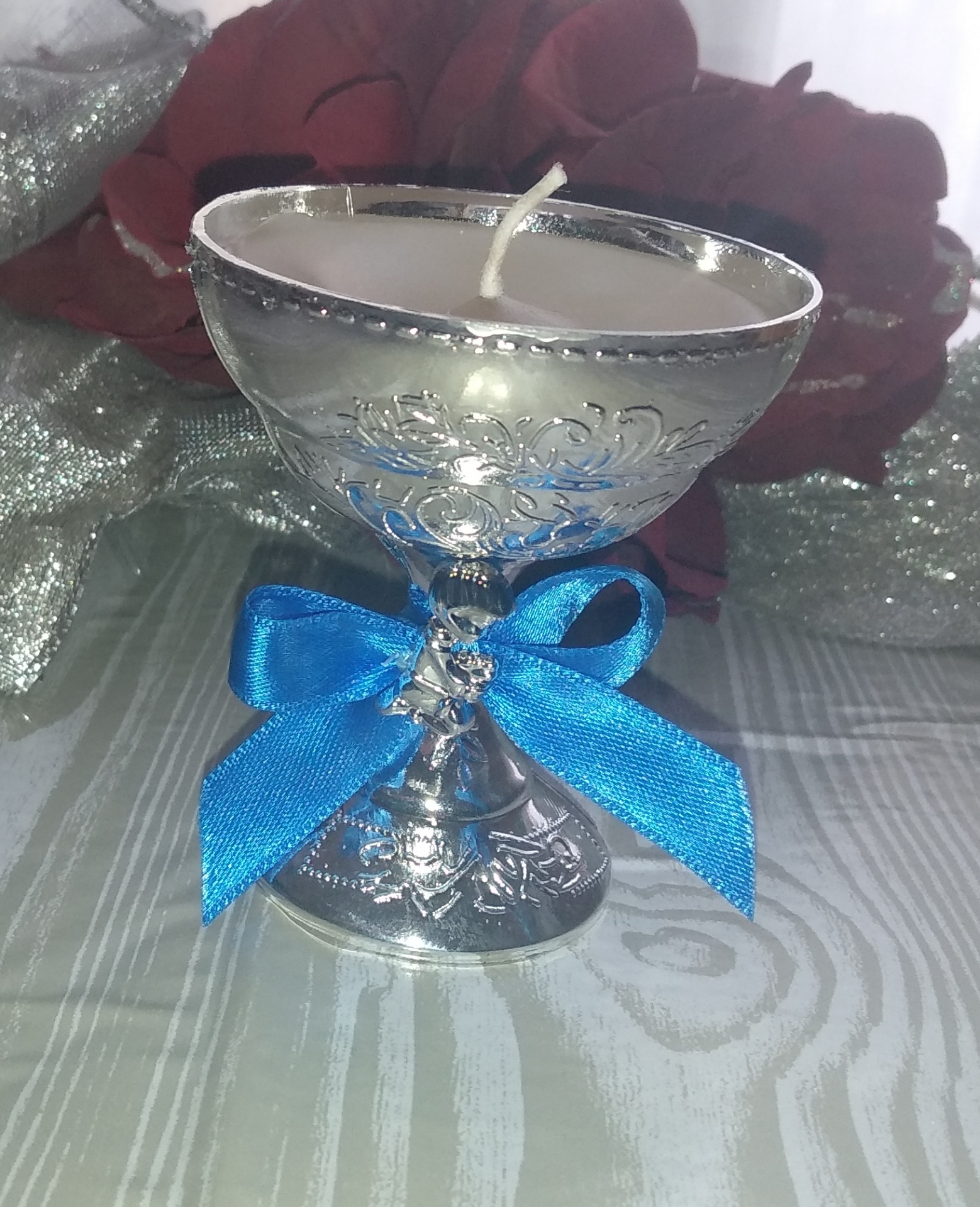 Vela branca num castiçal metálico prateado com laço azul, sobre superfície cinza e flores vermelhas ao fundo