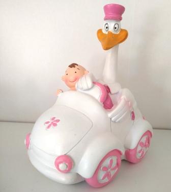 Figura decorativa de cegonha e bebé num carro branco com detalhes cor de rosa