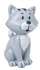 Figura decorativa de gato cinza e branco sentado com olhos grandes