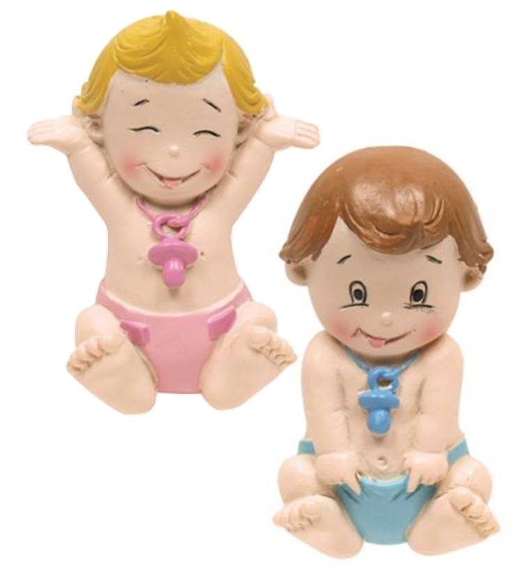 Bonecos decorativos de bebés em fraldas rosa e azul com chupetas e cabelo colorido