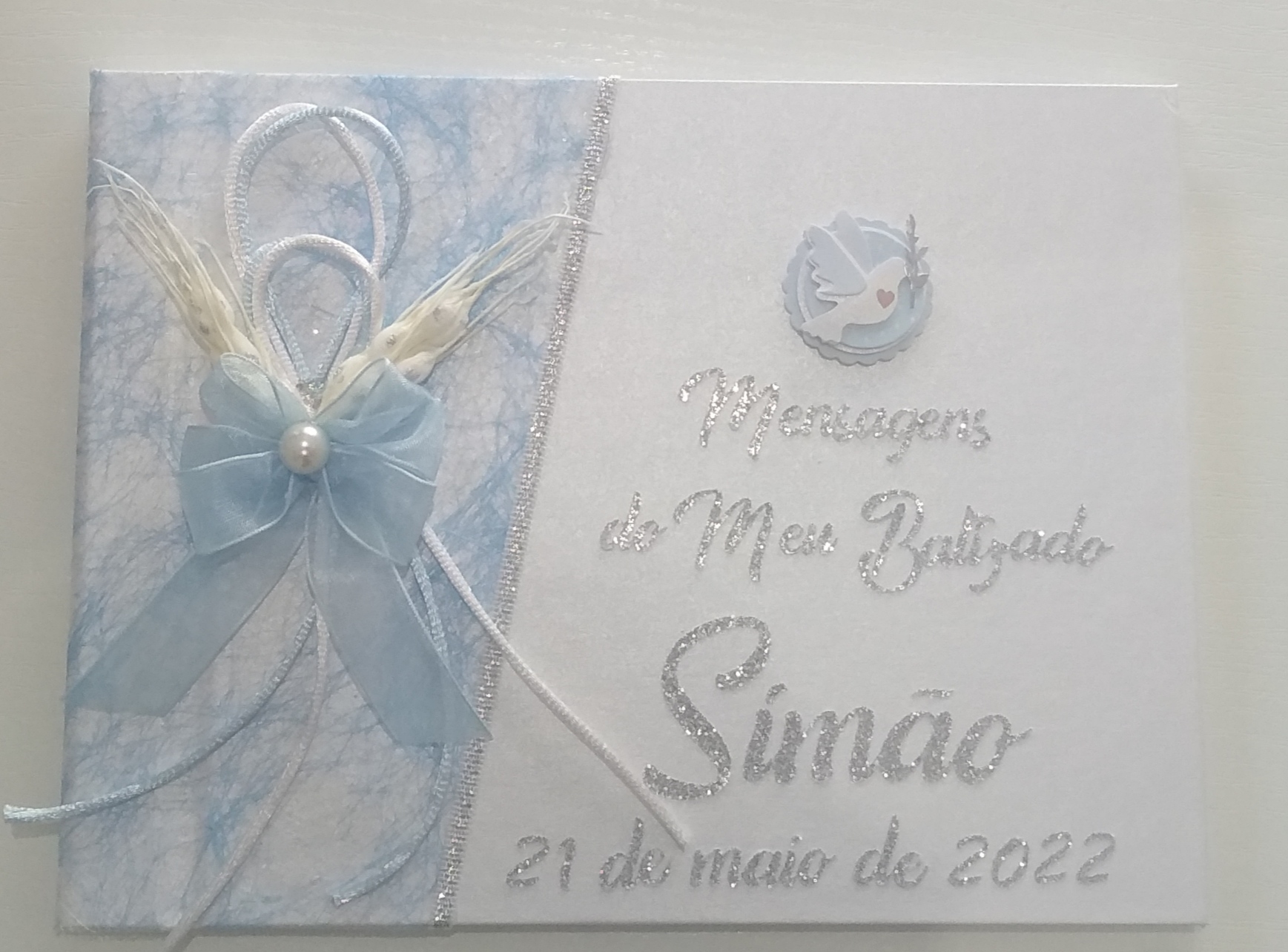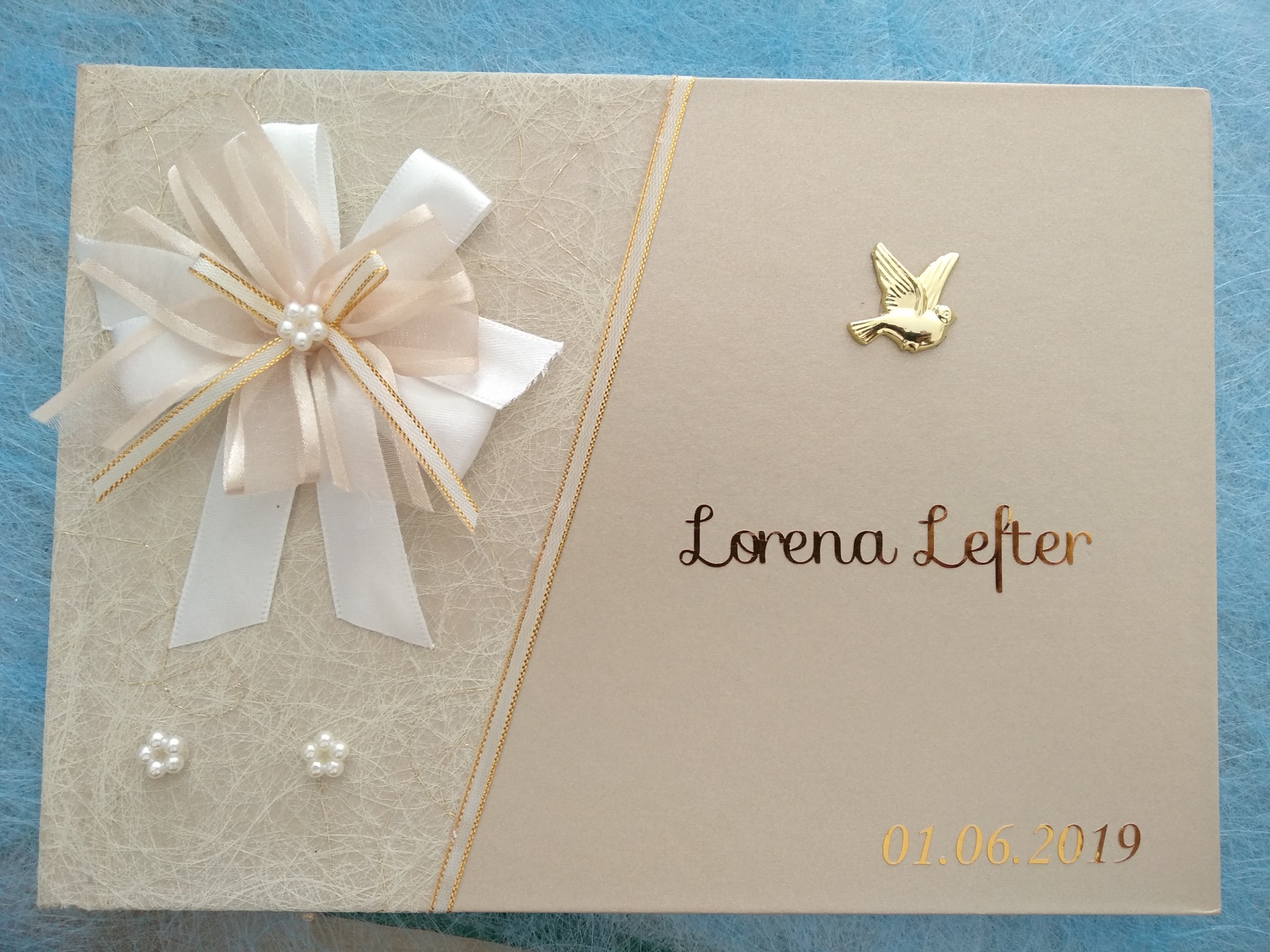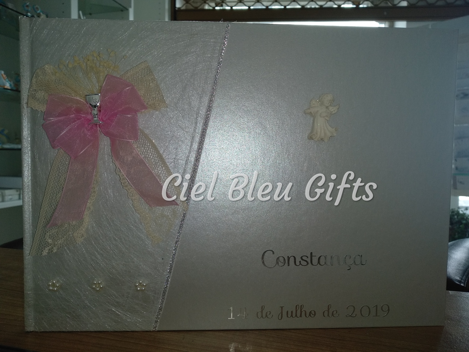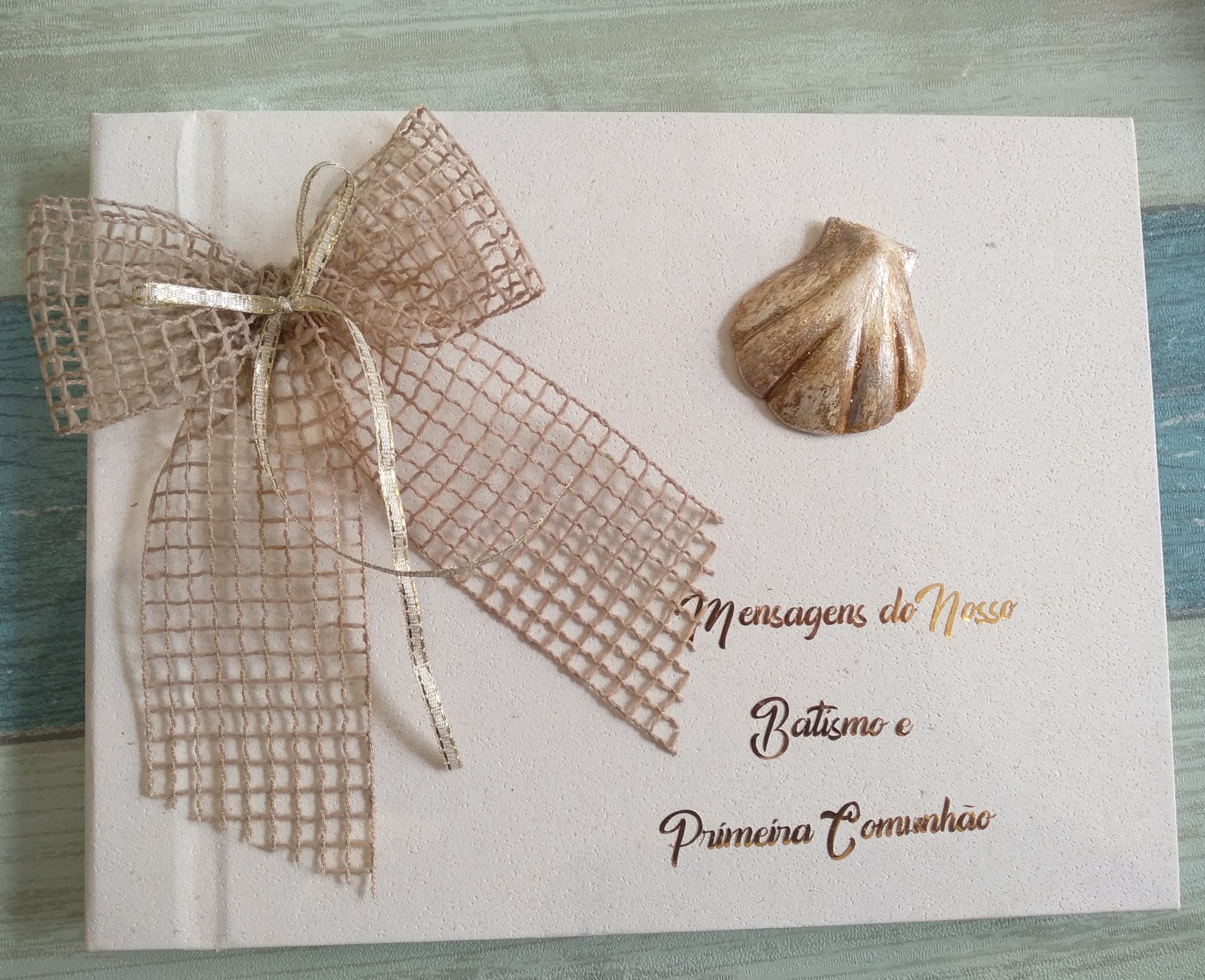Livro branco com laço em fita castanha e concha, texto sobre Batismo e Primeira Comunhão