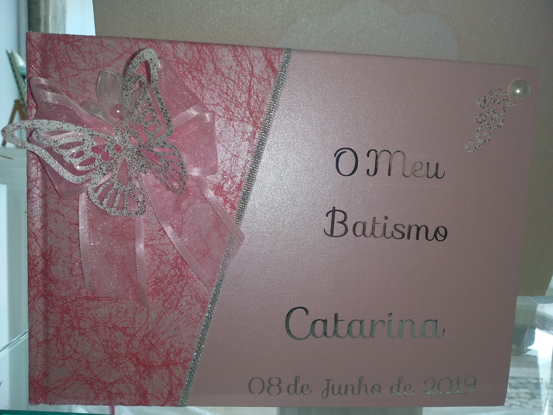 Livro de batismo rosa com decoração de borboleta e texto personalizado