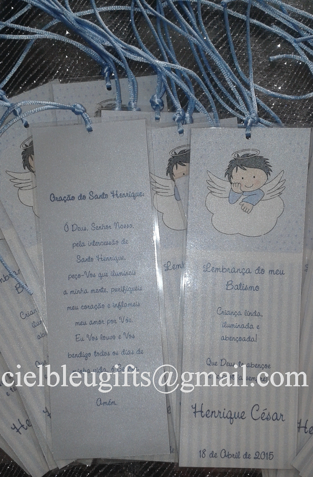 Marcadores de livros para Baptismo com anjinhos e texto em português