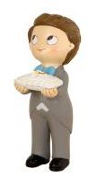 Boneco decorativo masculino com fato cinzento segurando bolo branco