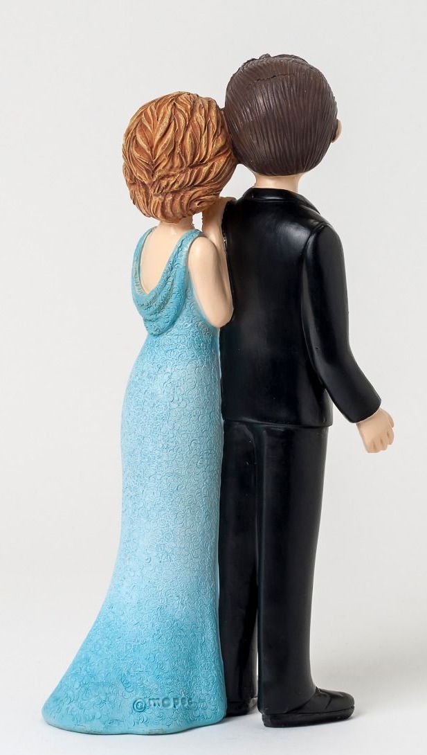 Figuras decorativas de um casal de costas, mulher de vestido azul e homem com fato preto