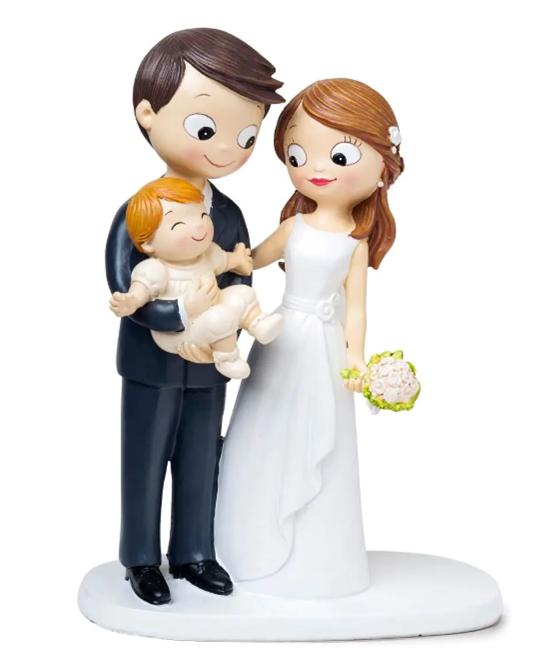 Figuras decorativas de noiva, noivo e bebé em base branca oval