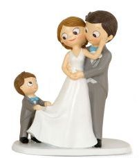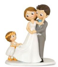 Figuras decorativas de casal de noivos e criança puxando o vestido