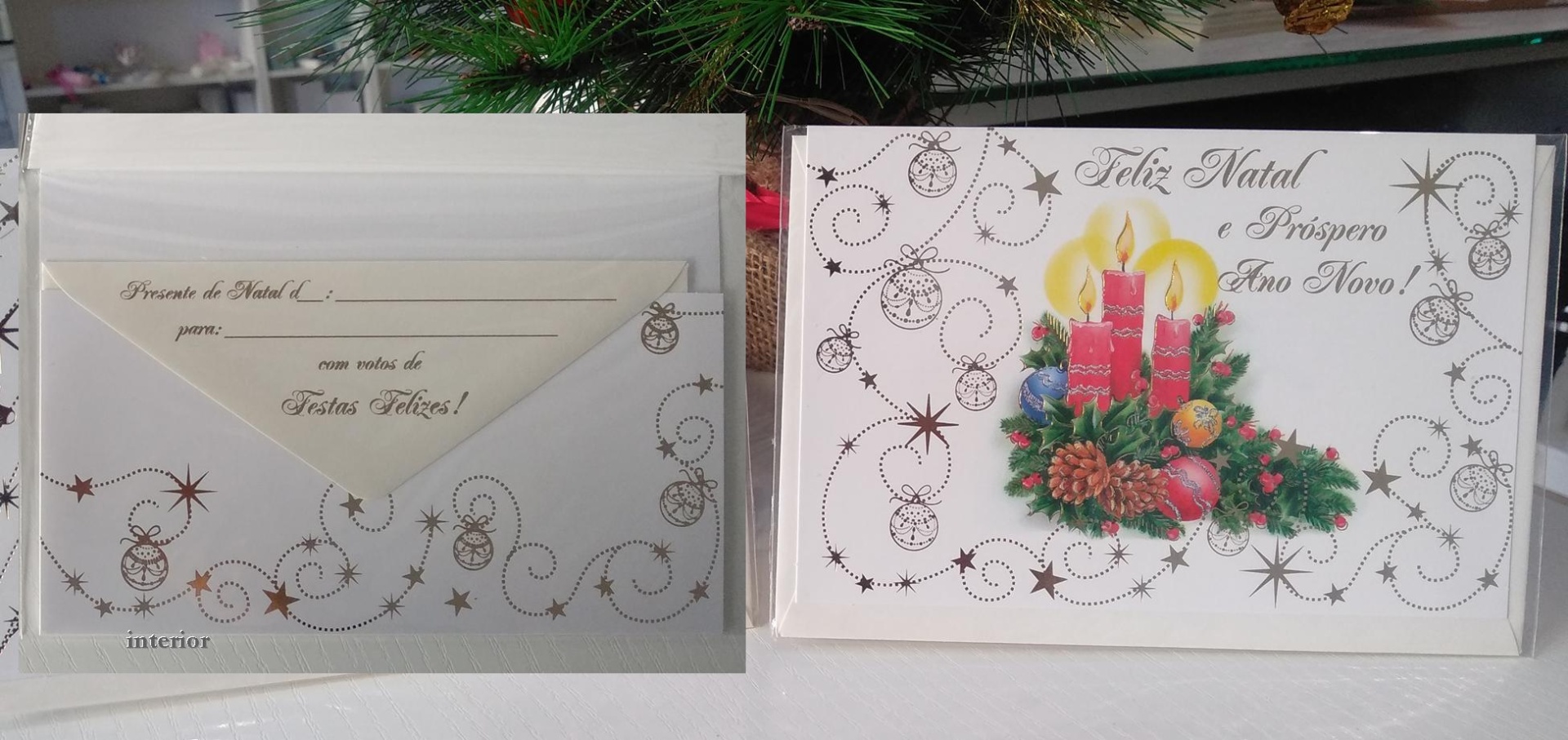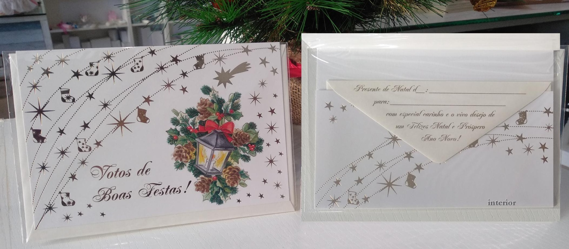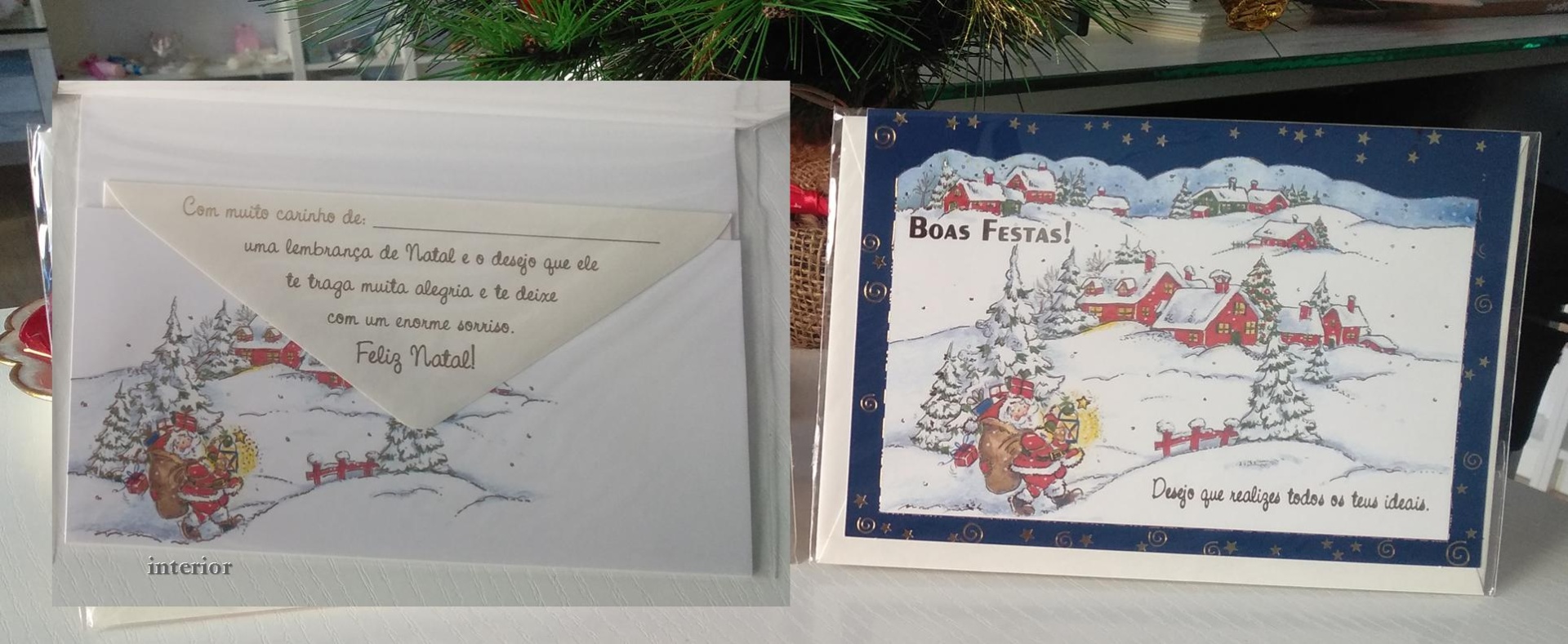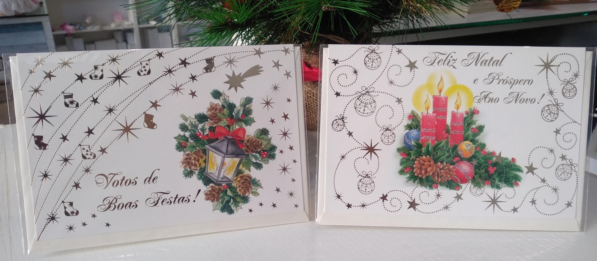 Cartões de Natal com ilustrações e mensagens de Boas Festas em papel e envelopes