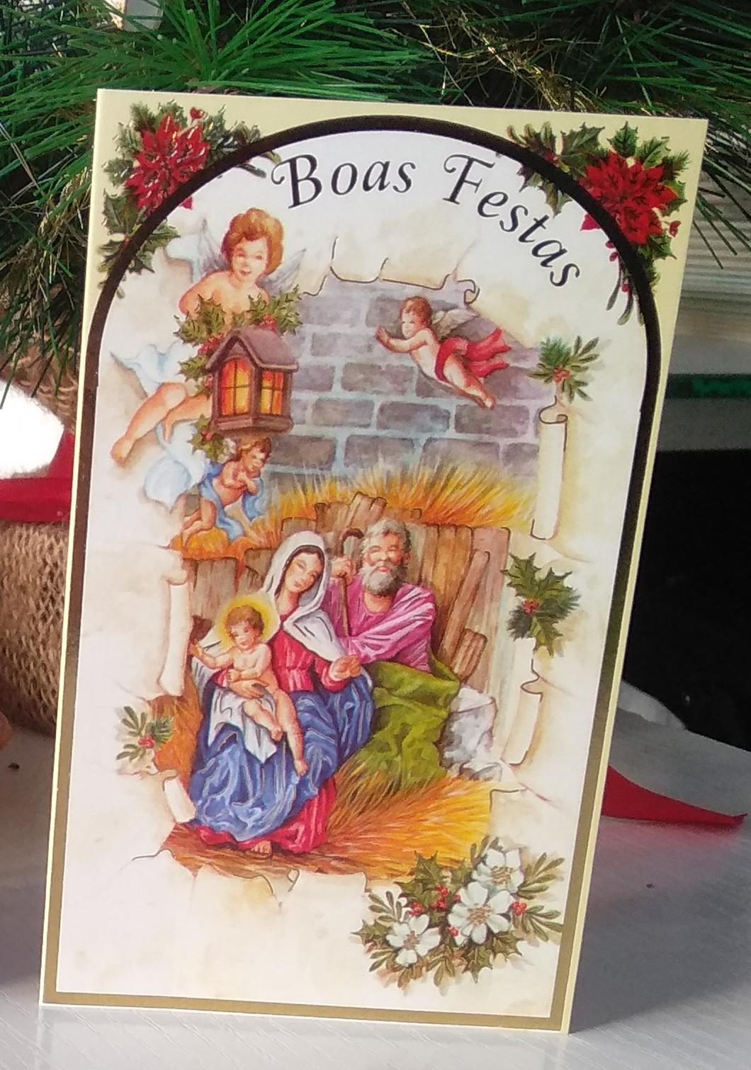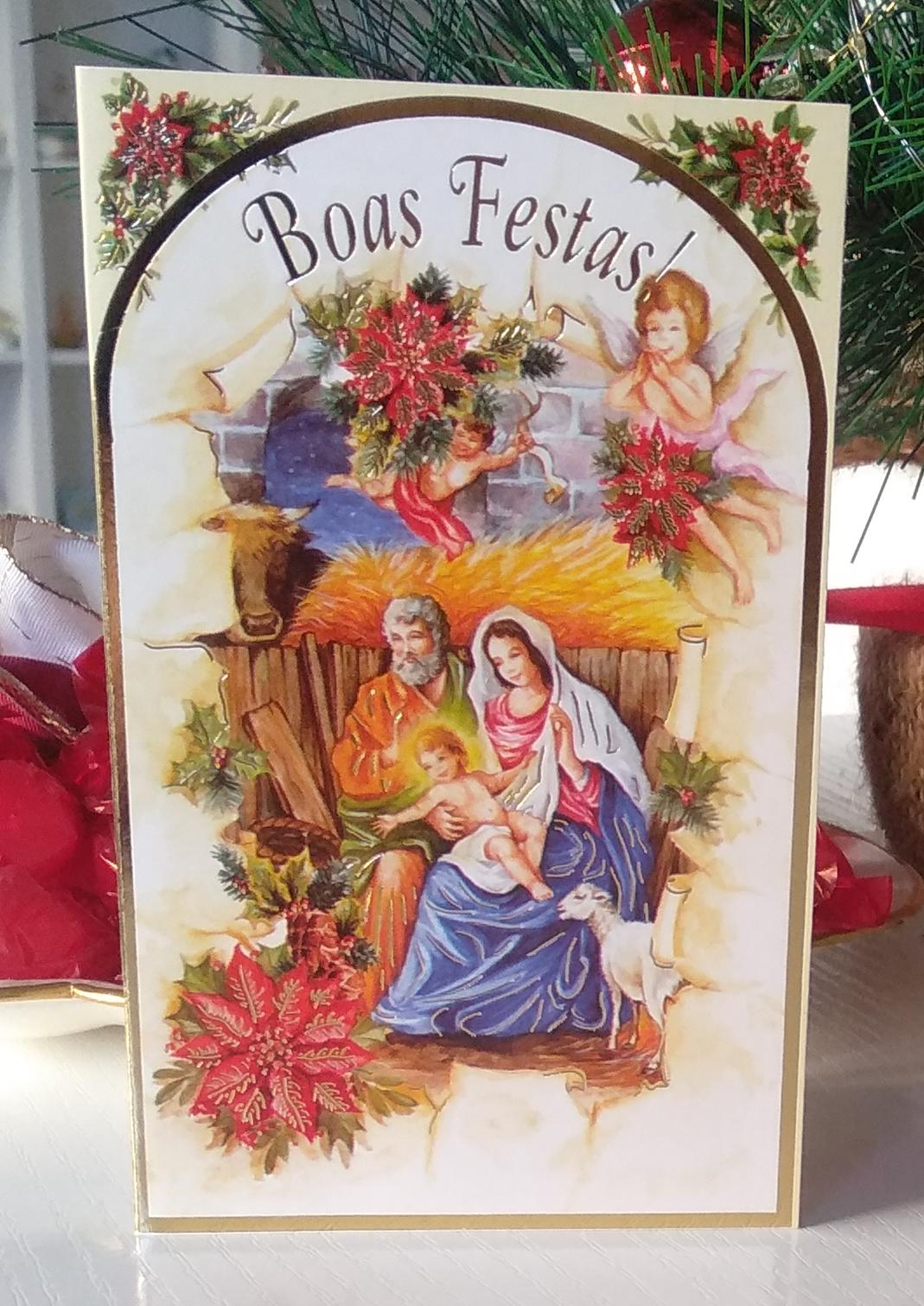 Cartão de Natal com imagem da Sagrada Família, anjos, flores vermelhas e texto Boas Festas