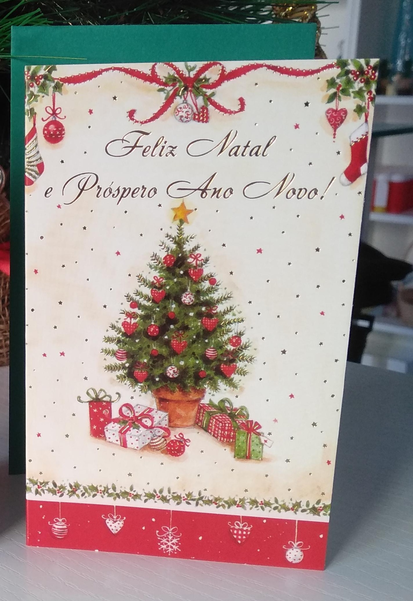 Cartão de Natal com árvore decorada, presentes e texto Feliz Natal e Próspero Ano Novo