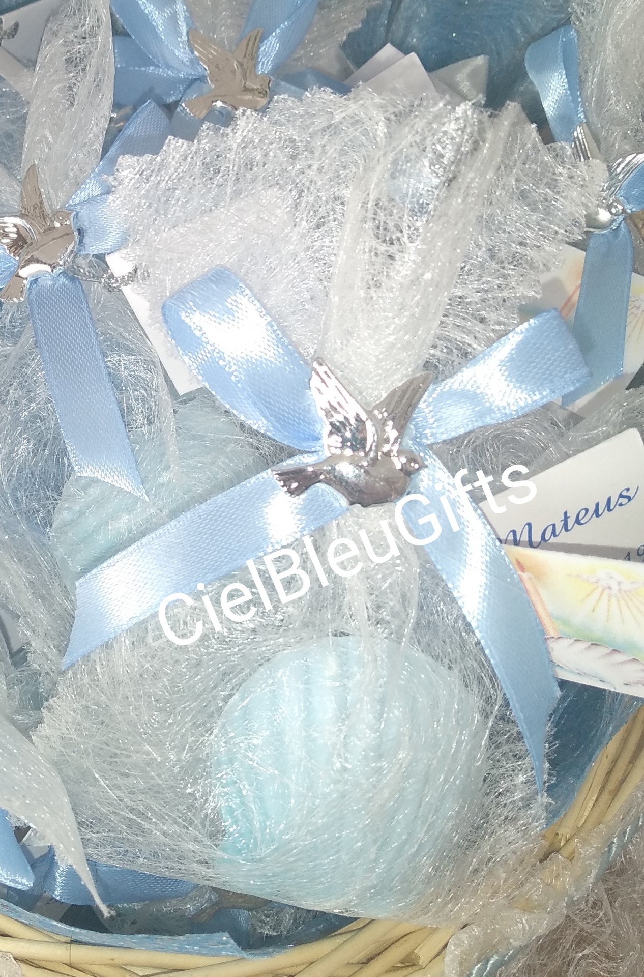 Sabonete azul em rede branca com fita azul e pendente prateado em forma de pomba