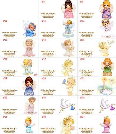 Ilustrações coloridas de anjos bebês com mensagens personalizáveis sobre fundos brancos