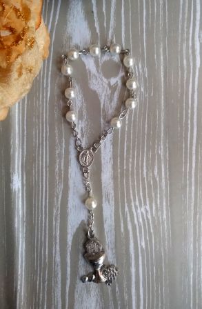 Terço com contas de pérolas e crucifixo metálico numa superfície de madeira cinzenta