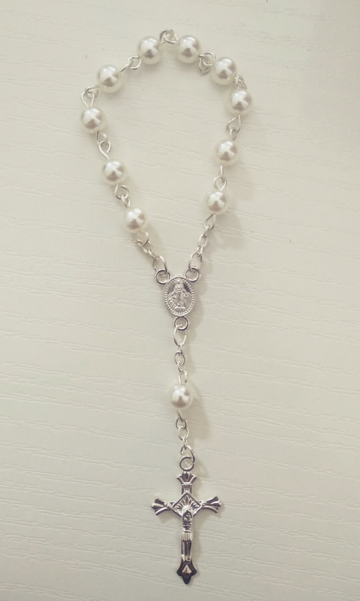 Terço com contas peroladas e crucifixo metálico