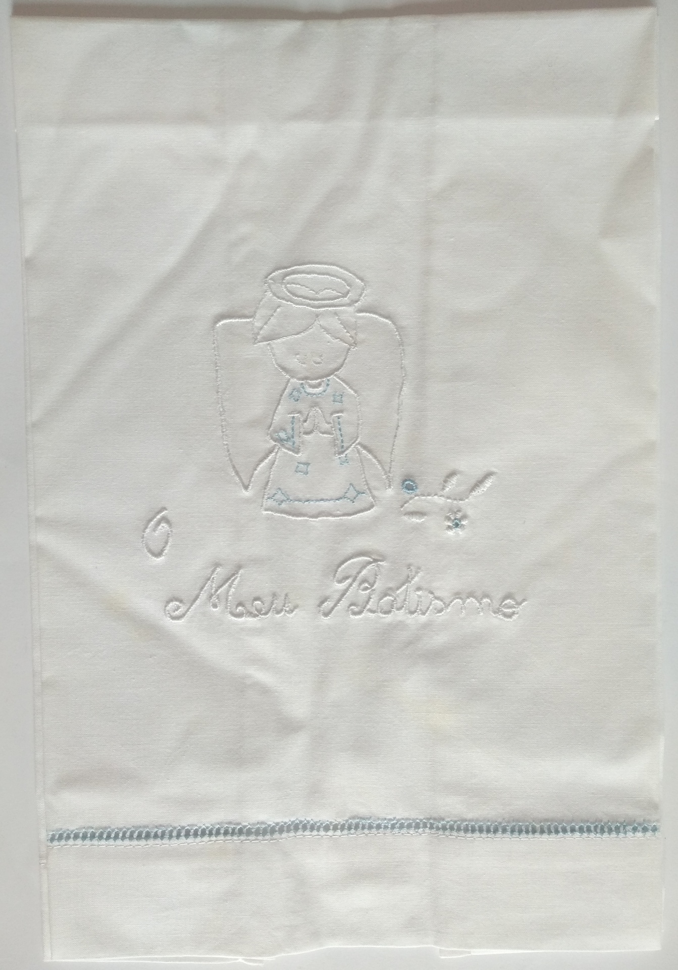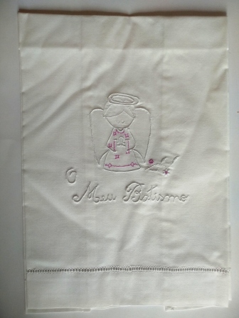 Toalha branca bordada com anjo e texto O Meu Batismo