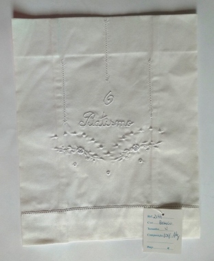 Guardanapo branco bordado com número 6 e texto Pacheco