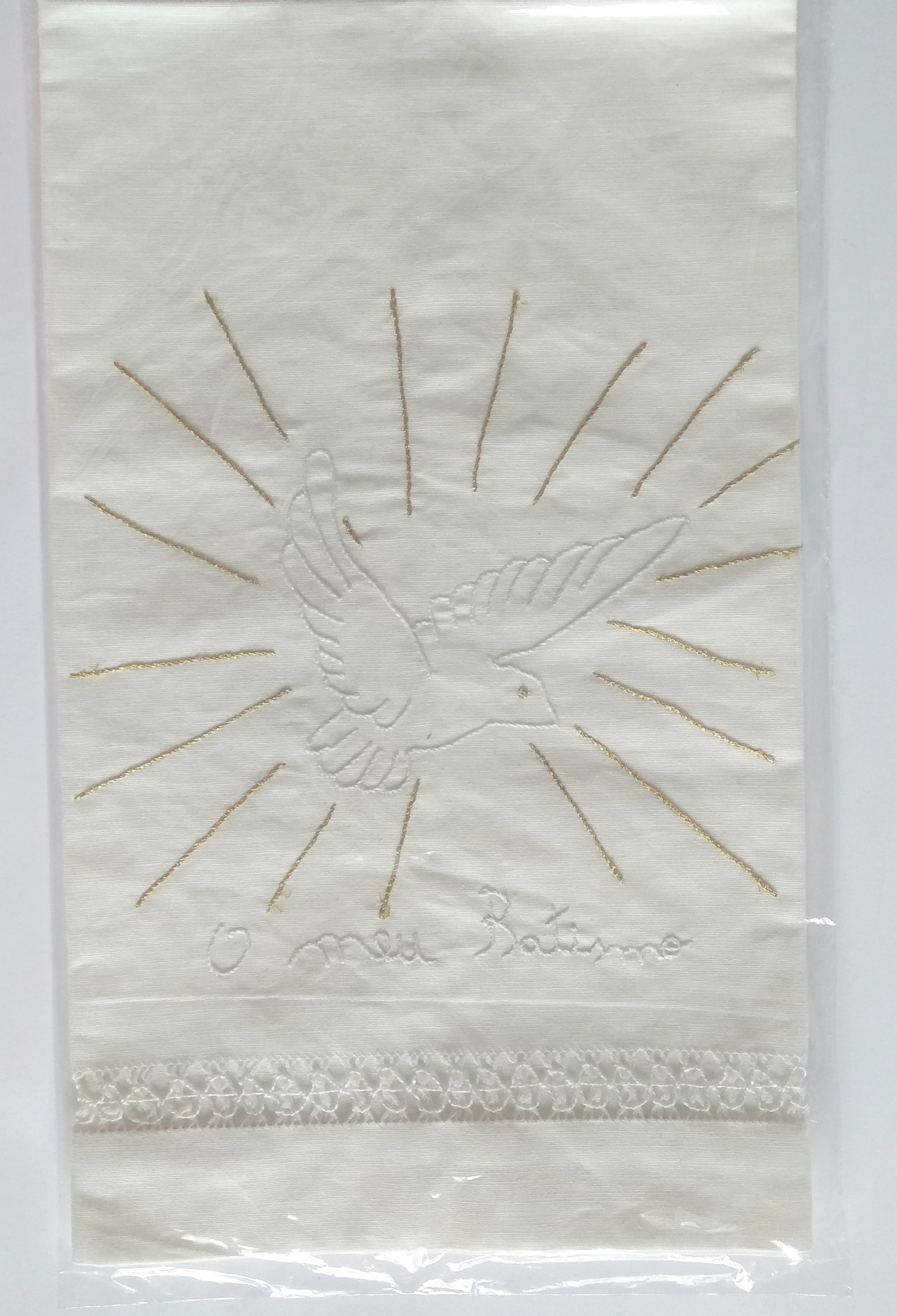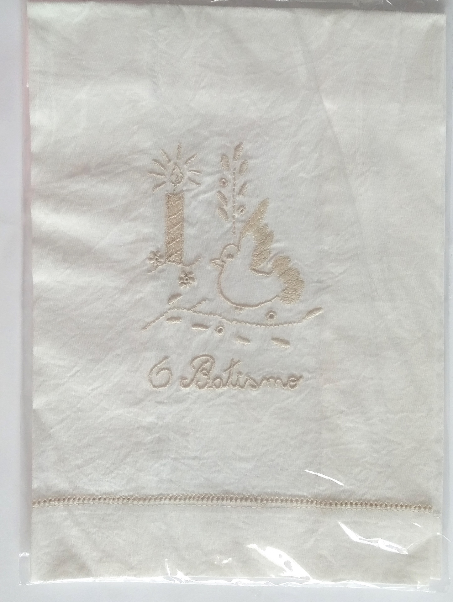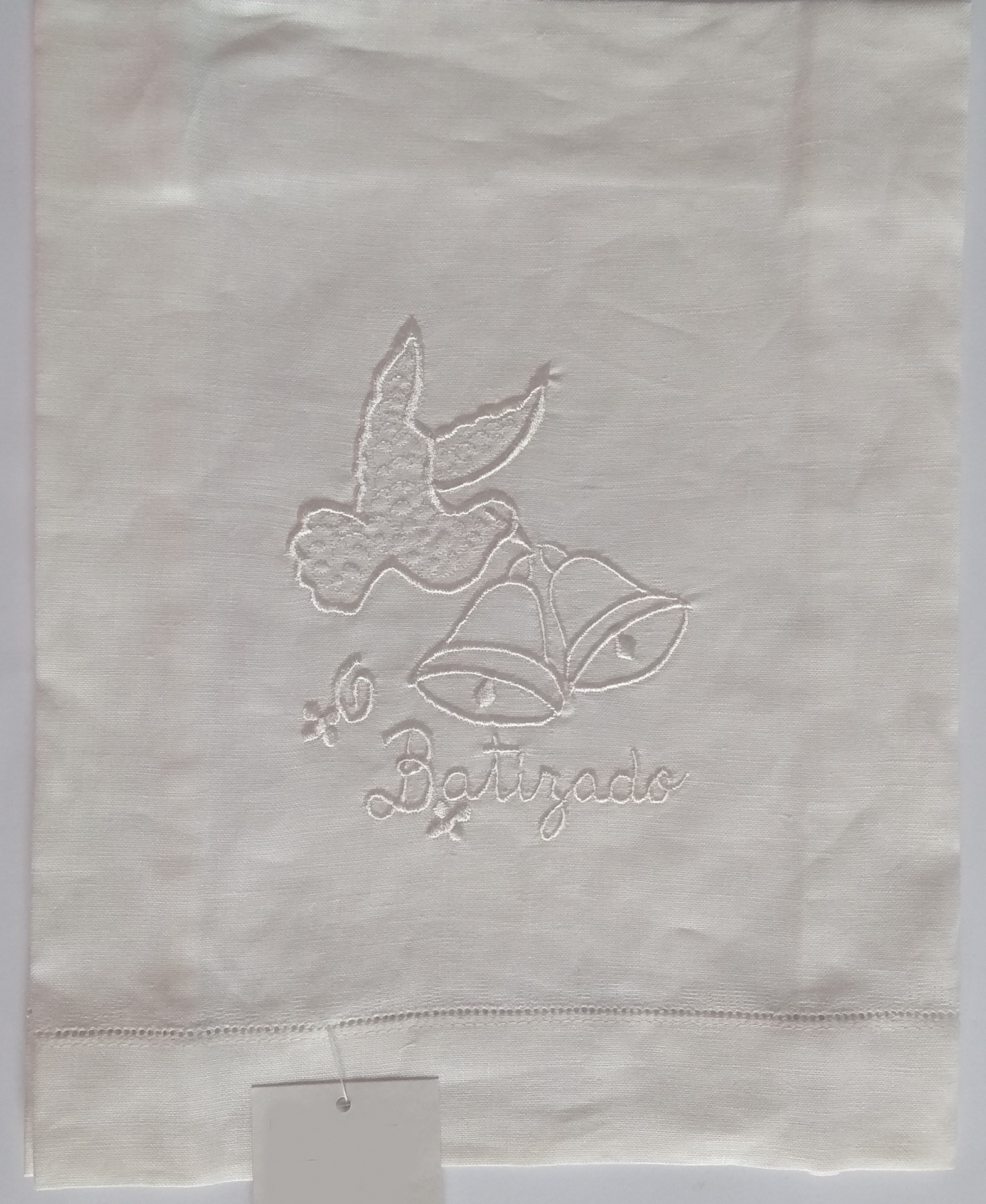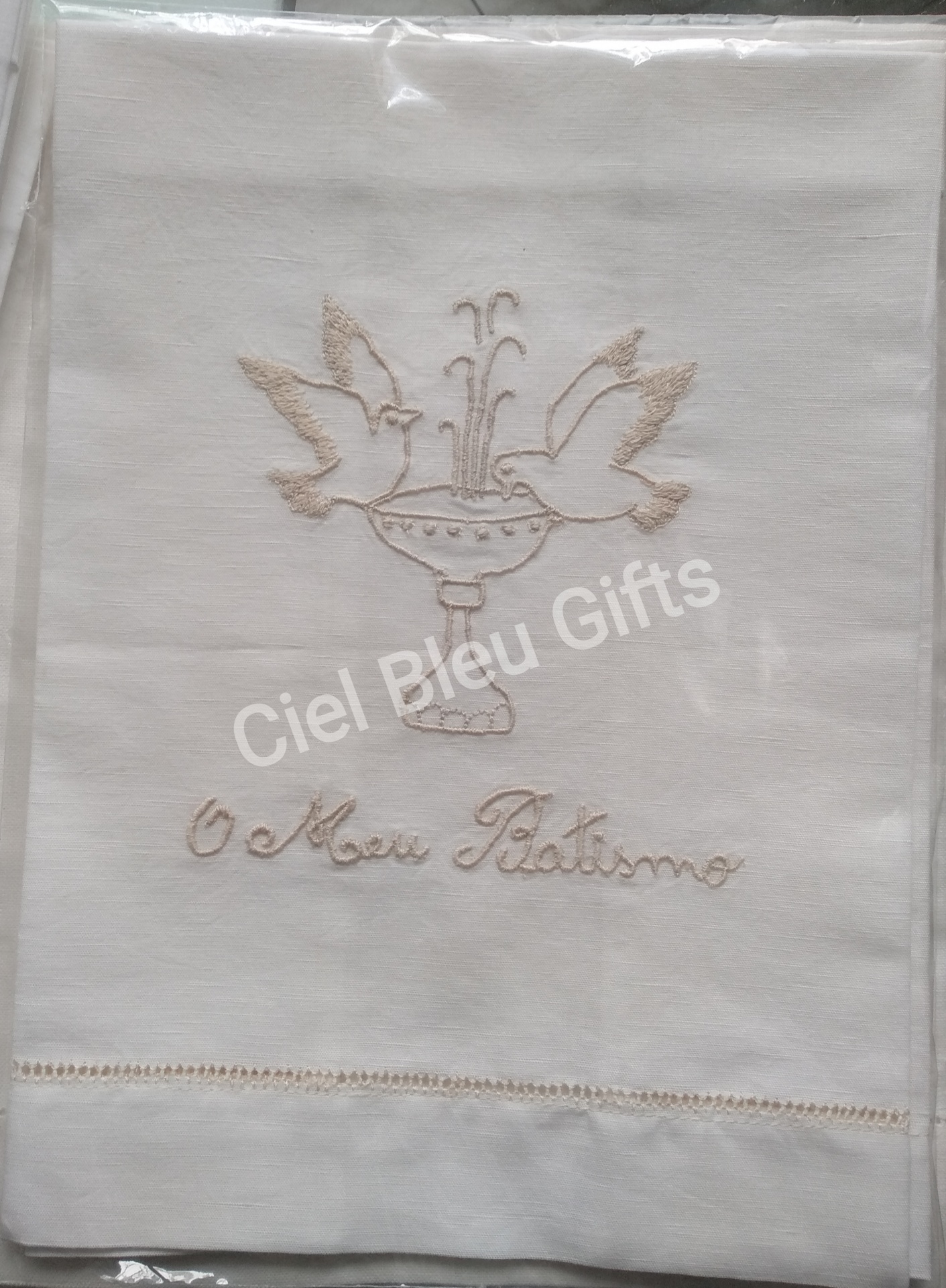 Toalha branca bordada com tema de batismo, pombas e texto em bege