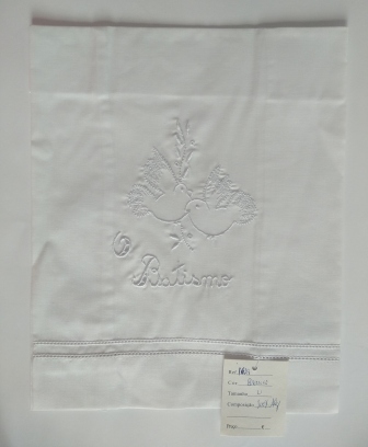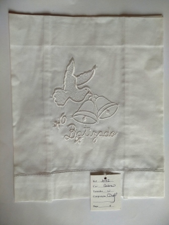 Pano branco bordado com aves e palavra Batismo, renda e etiqueta adesiva