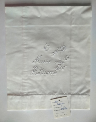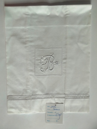 Toalha branca com bordado da letra B e etiqueta manuscrita
