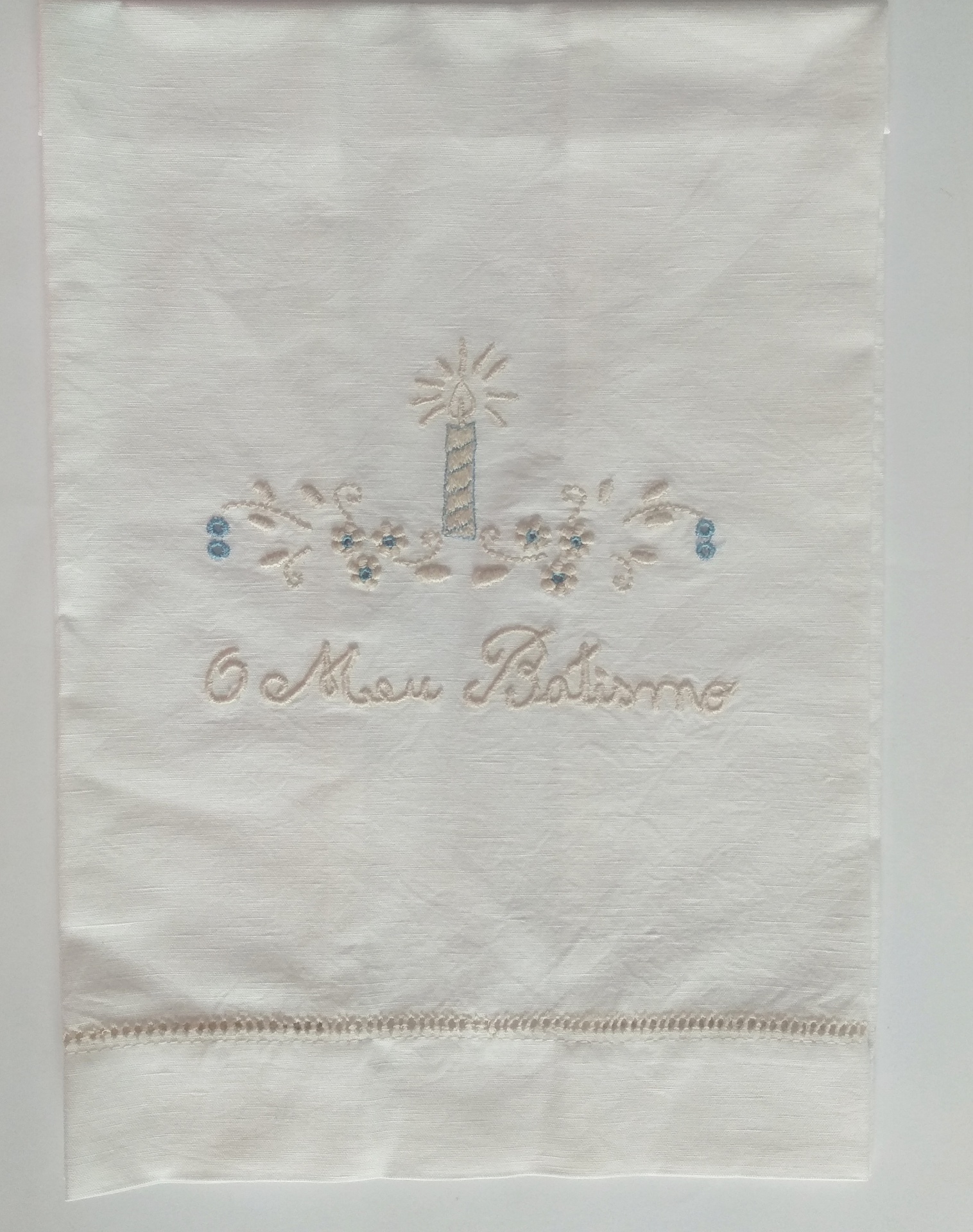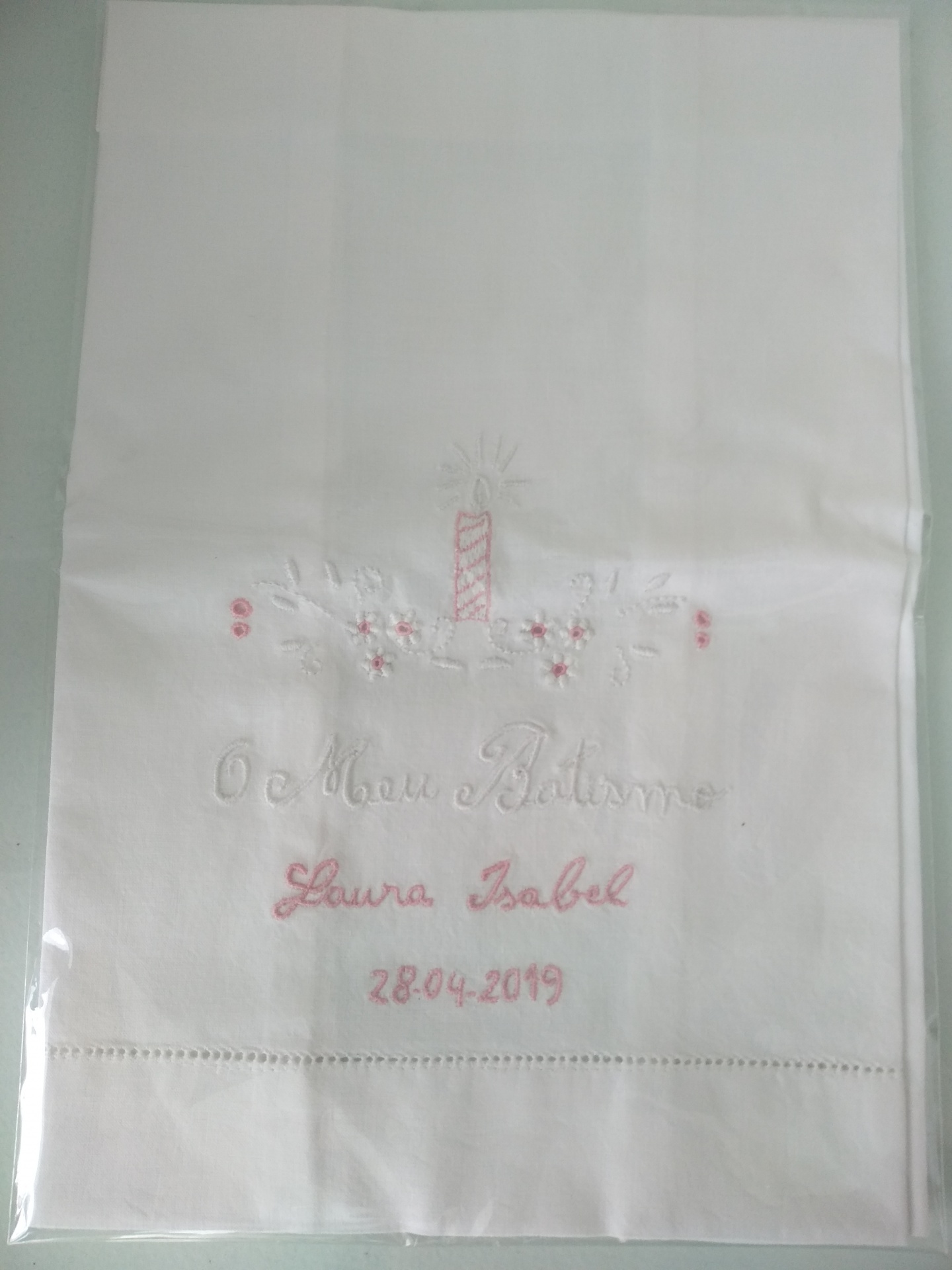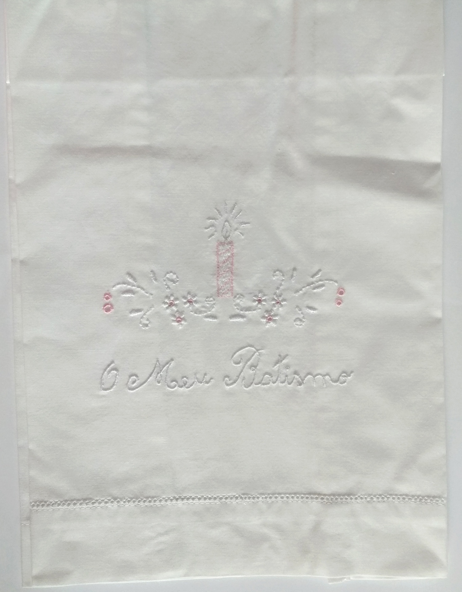 Toalha branca bordada com vela, pomba e texto '6 Batismo', embalada em plástico
